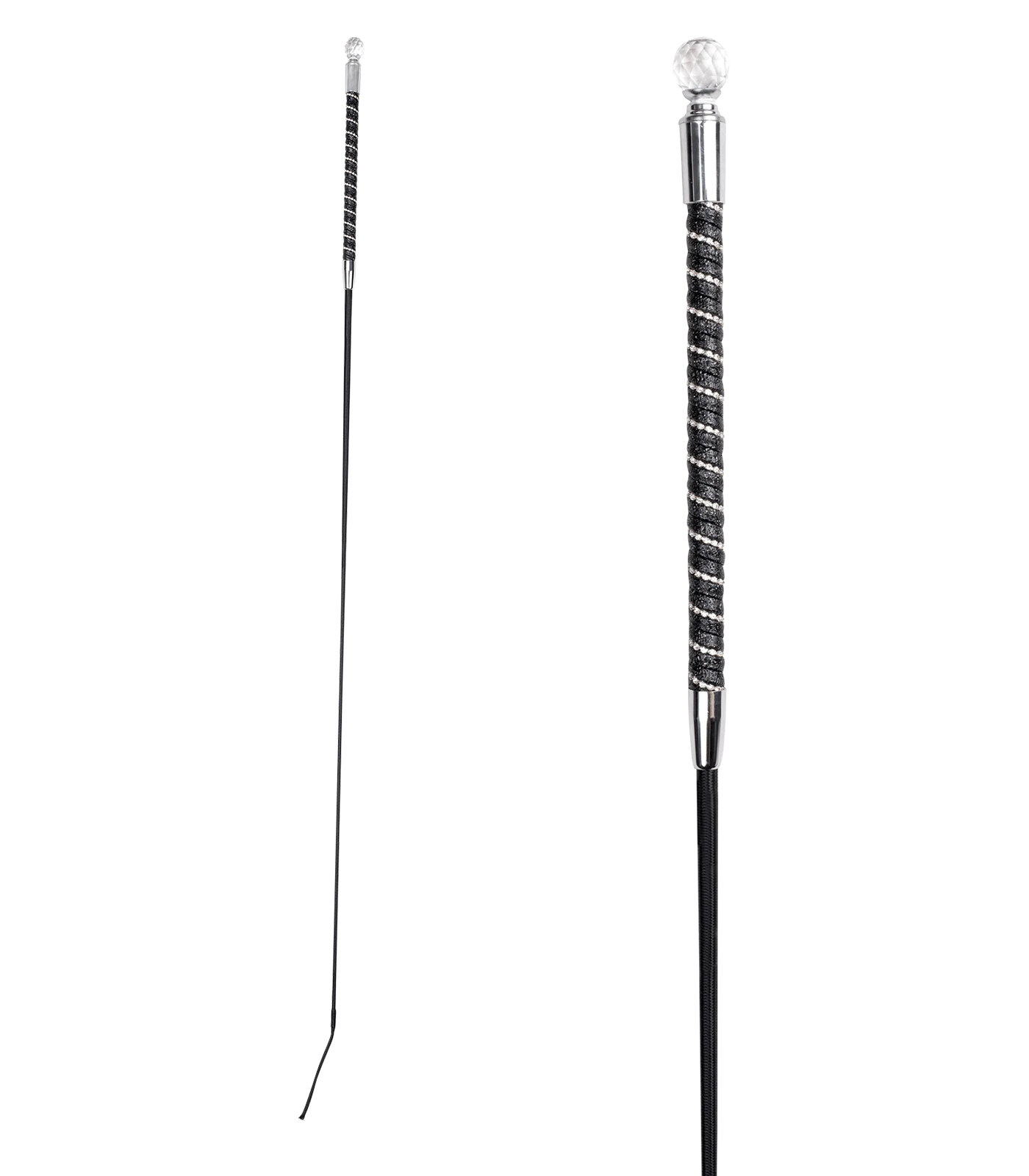 - Dressage whip with an elaborately finished crystal polyurethane-leather handle. A particular highlight are the silver-coloured fittings, enhanced with a large crystal.