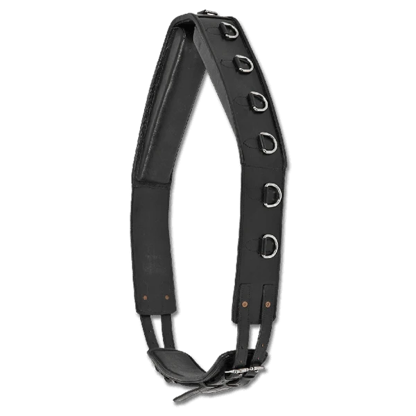 Leather surcingle – 13 rings allow individual attachment of the lunging reins: also ideal for double lunge reins. Softly padded. Stainless steel rings.