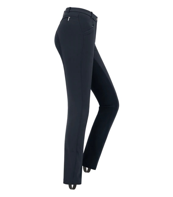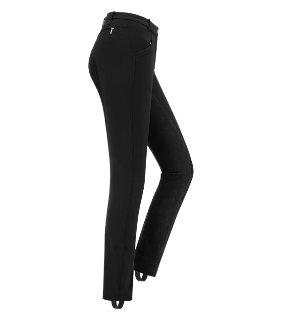 – Jodhpurs with elastic stirrup at bottom of flared leg, and synthetic leather full seat