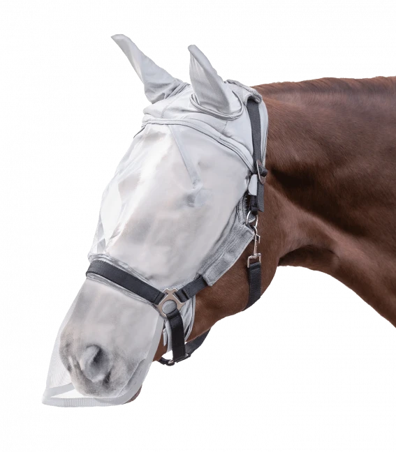 - Ideal protection from pesky insects. The fur padding in the forehead area prevents chafing. Extra room around the sensitive eye area. The nose fastening is elastic and can be individually adjusted. Touch tape fasteners on the cheekpieces and on the poll help make it easy to attach to the halter. With UV protection.