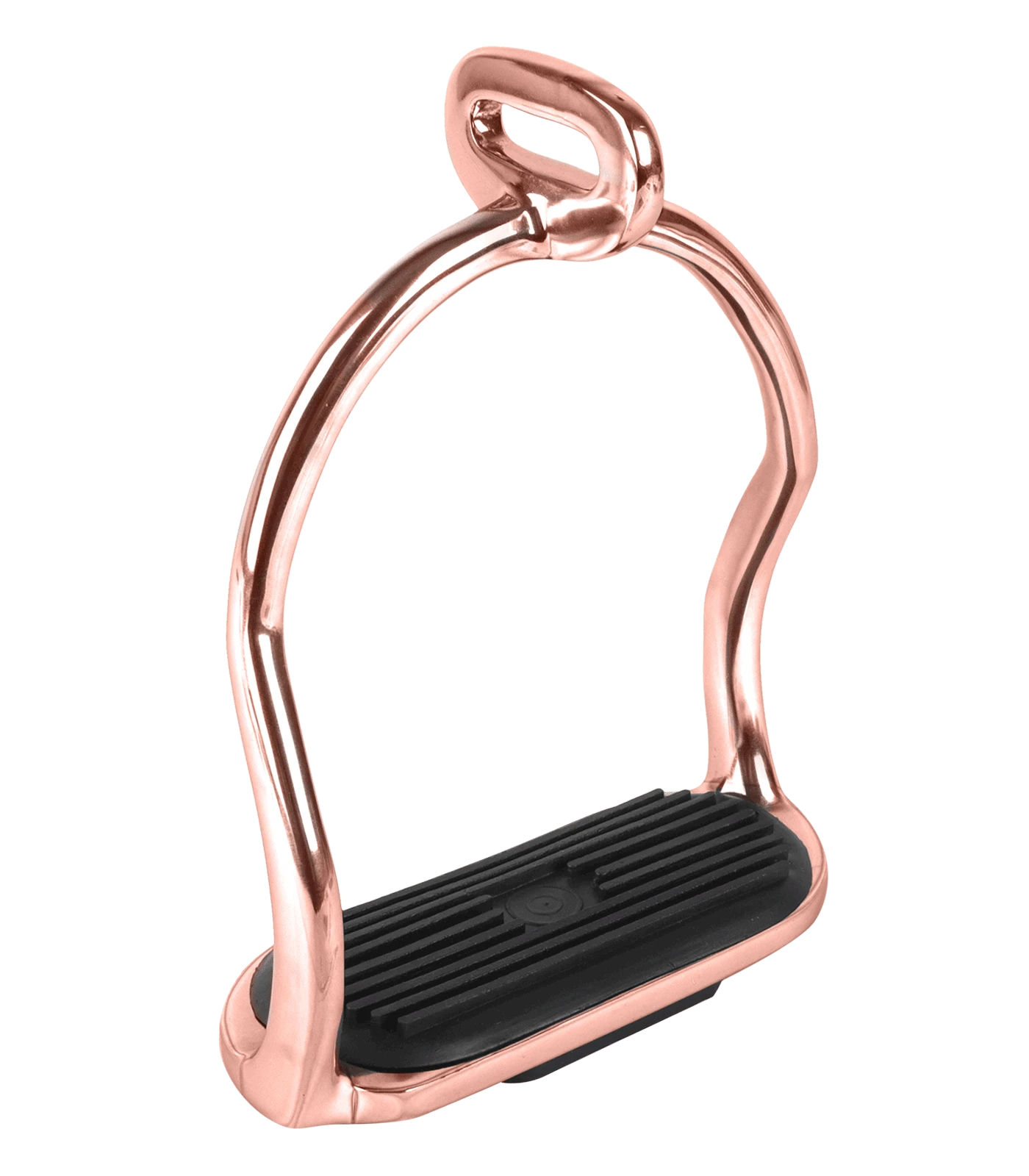 • Stainless steel stirrups with curved shanks and eye for stirrup leather at 90°. In rose gold finish. Pair.