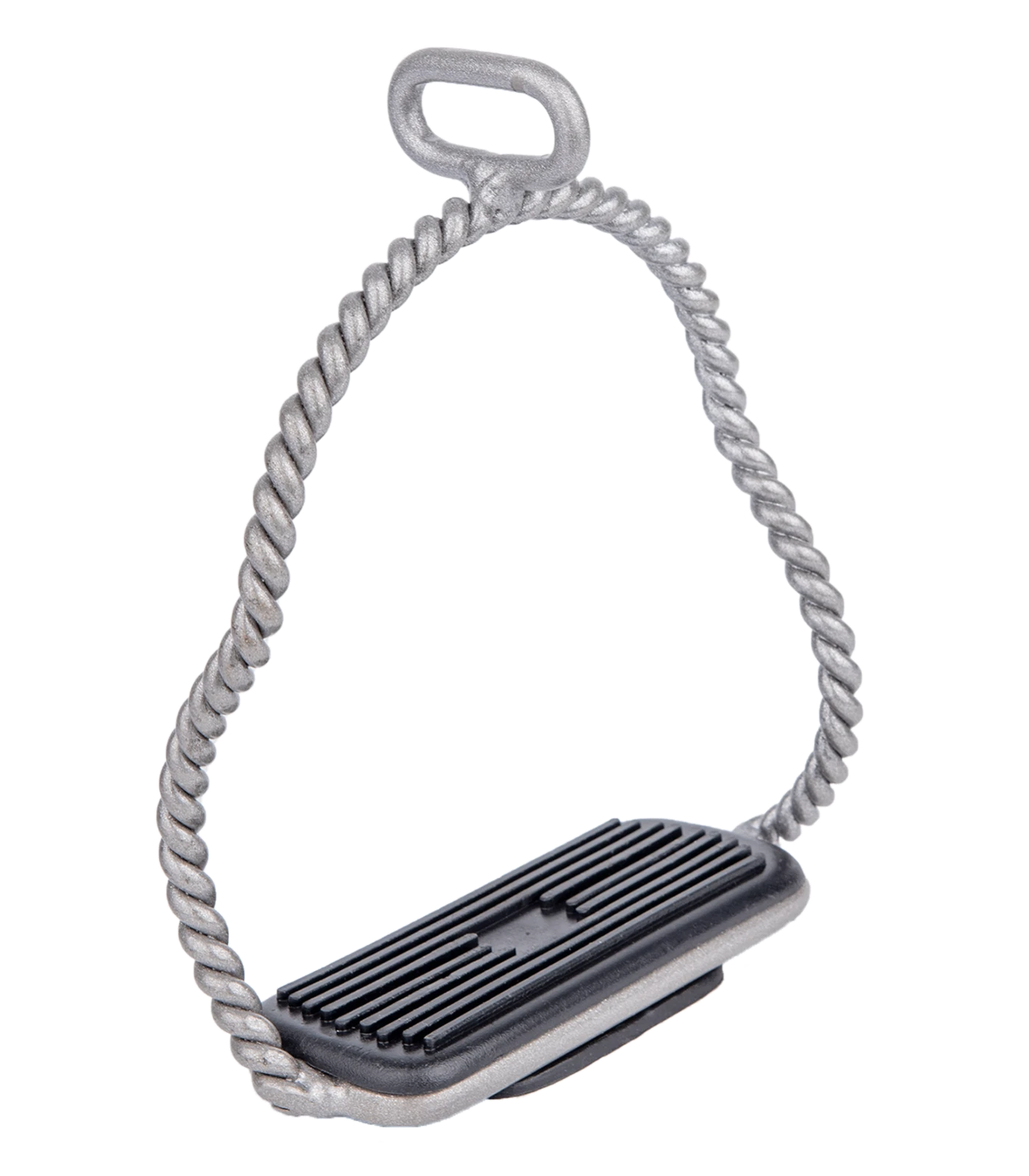 - Stainless steel stirrups with eye at 90° and black rubber tread insert. The curved branches are in twisted stainless steel. Pair.