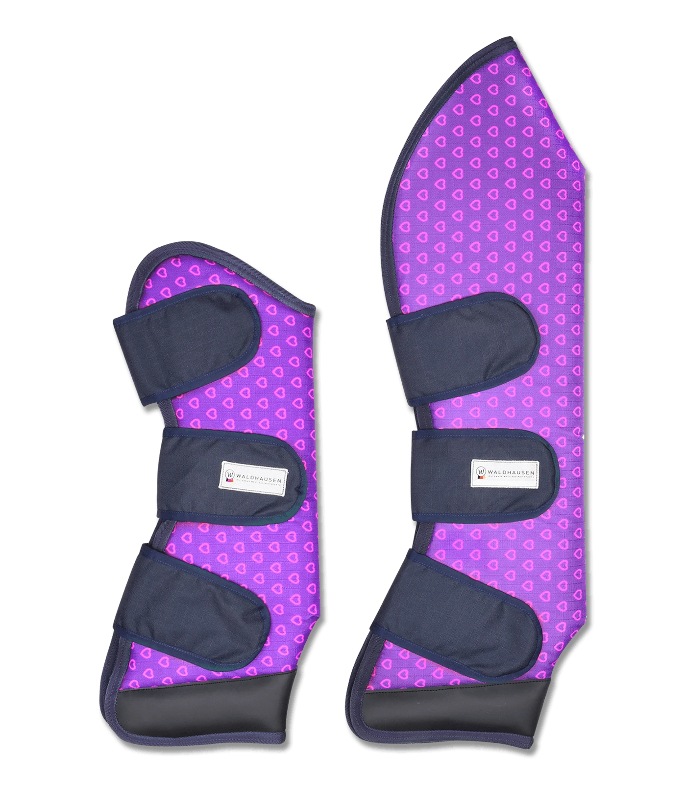 Anatomically shaped travelling boots in trendy little hearts design, colour-matched to Unicorn series. Three strong Velcro fasteners for optimum hold on horse”s leg. Shock-absorbing foam inside and high cut. Soft fleece lining for optimum wearer comfort. Hardwearing 600 denier outer material with reinforcement in heel area.