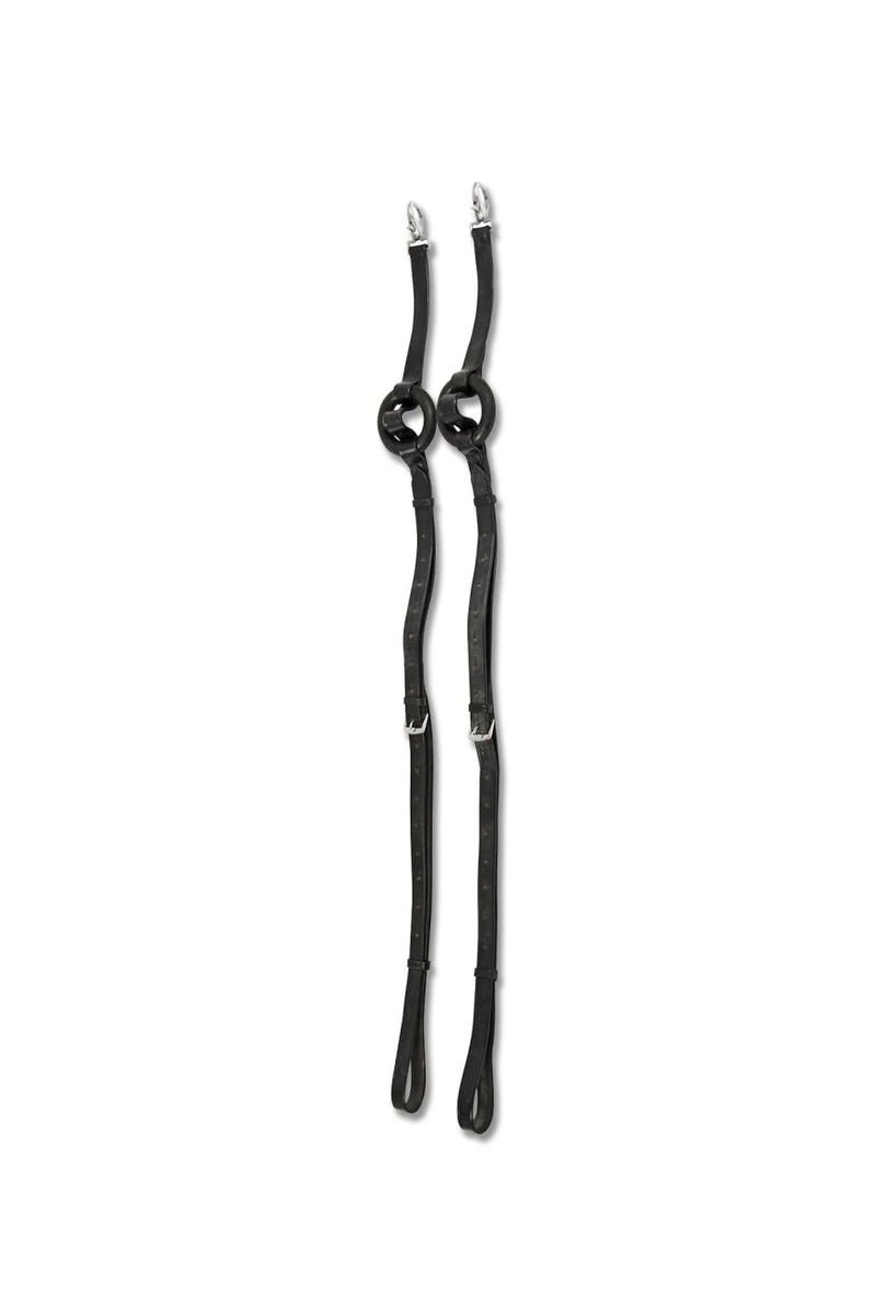 Der Ausbindezügel ist mehrfach verstellbar und mit Gummiringen versehen.
