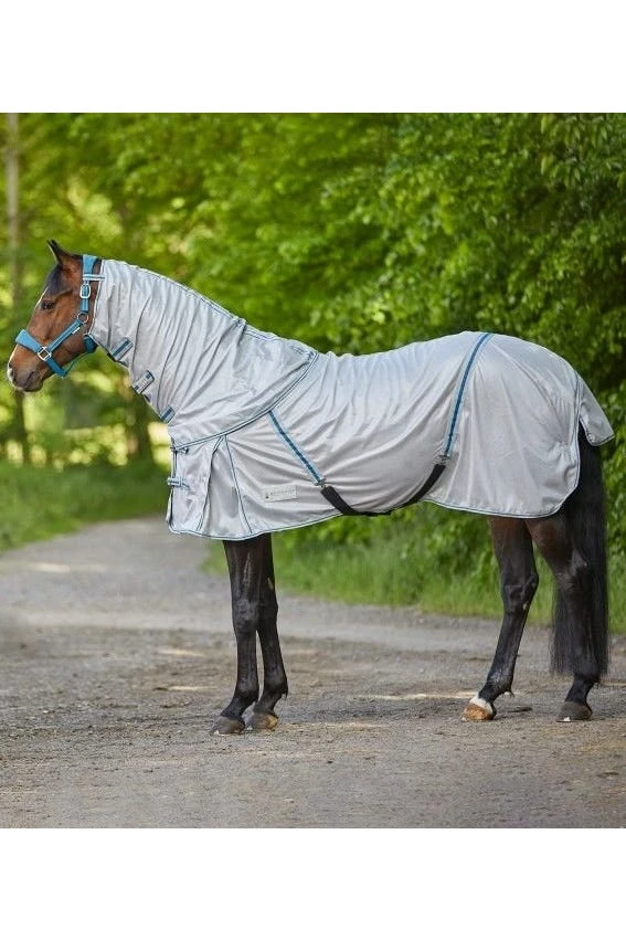 Die Fliegendecke ist zudem mit einem doppelten Frontverschluss, Beinschnüren sowie einer Schweifkordel ausgestattet. Dies sorgt für einen guen Sitz der Fliegendecke.