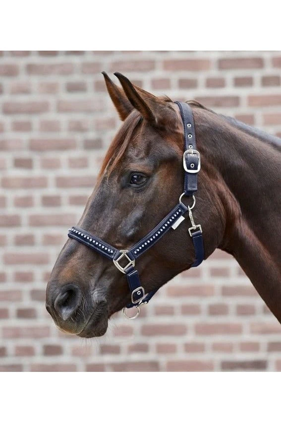 Es ist mit Strasssteinen auf dem Samtband geschmückt und am Kinnriemen und Genickstück ist das Halfter mehrfach verstellbar.