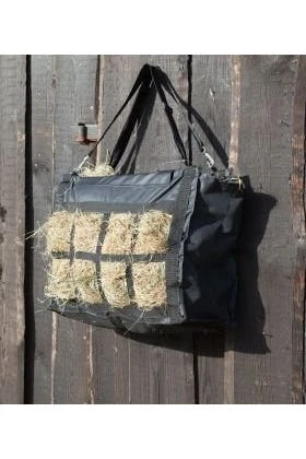 Außerdem verfügt sie über zwei verstellbare und abnehmbare Träger zum Umhängen und Aufhängen um die Tasche mit Heu zu befüllen.