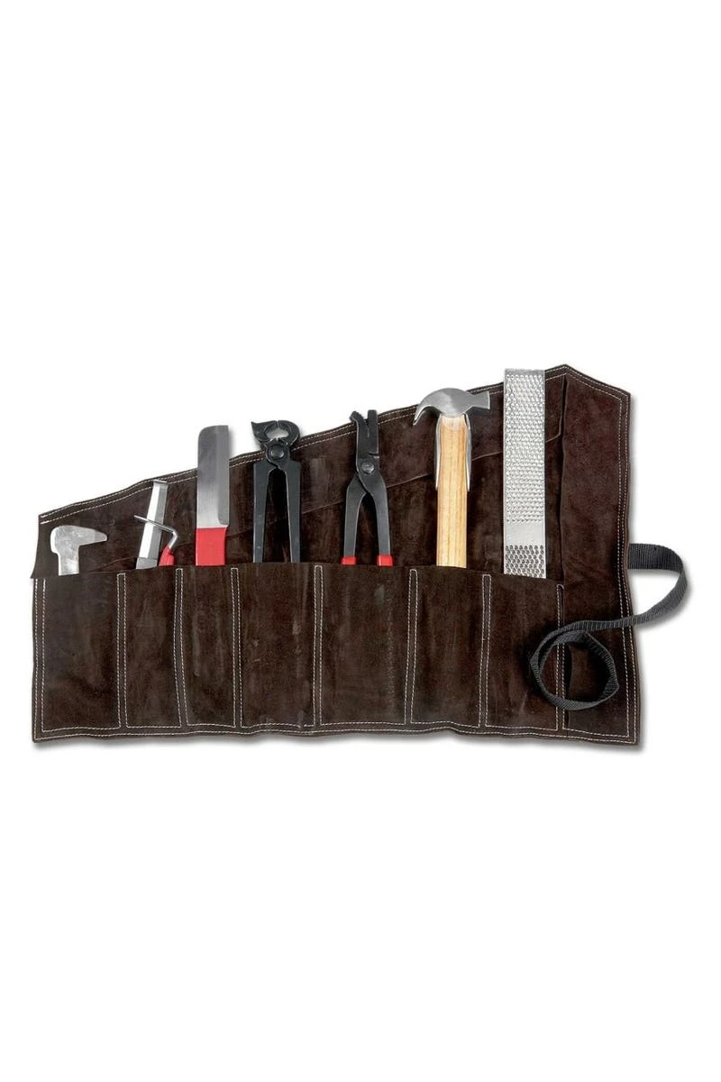 - Inhalt: Raspel, Hufrinnmesser, Hauklinge, Beschlagszange, Hammer, Hufkratzer, Unterhauer und Krokodilzange.