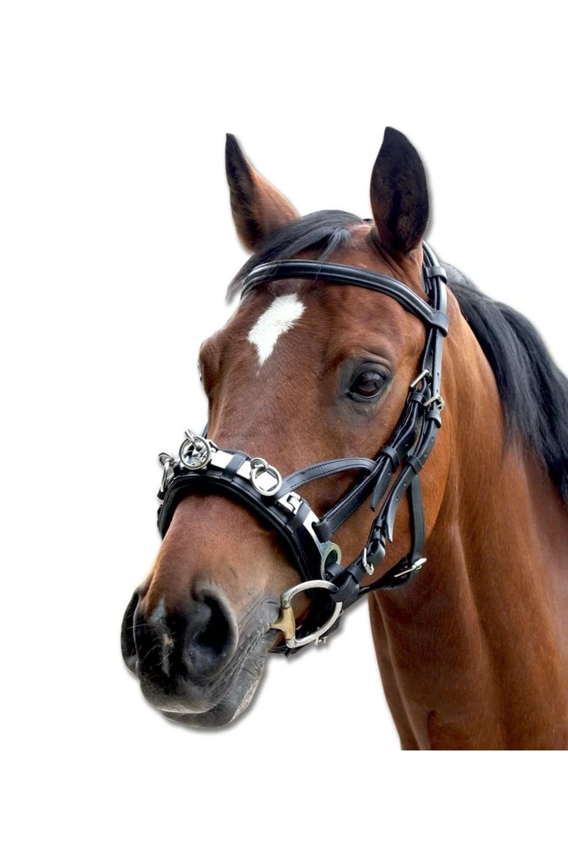 Der Kappzaum verfügt über Edelstahlbeschläge und die Lieferung erfolgt ohne Gebiss.